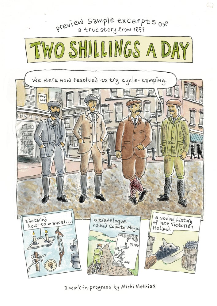 Excerpts from work-in-progress graphic novel, the story of the world's first cycle-camping tour in 1897 with four people in one tiny lightweight tent. Wearing woollen suits, riding single-geared steel bikes on unpaved roads over hilly western Ireland. With pages showing packing bike bags, putting up tent, cooking breakfast, and how to make your own tent!